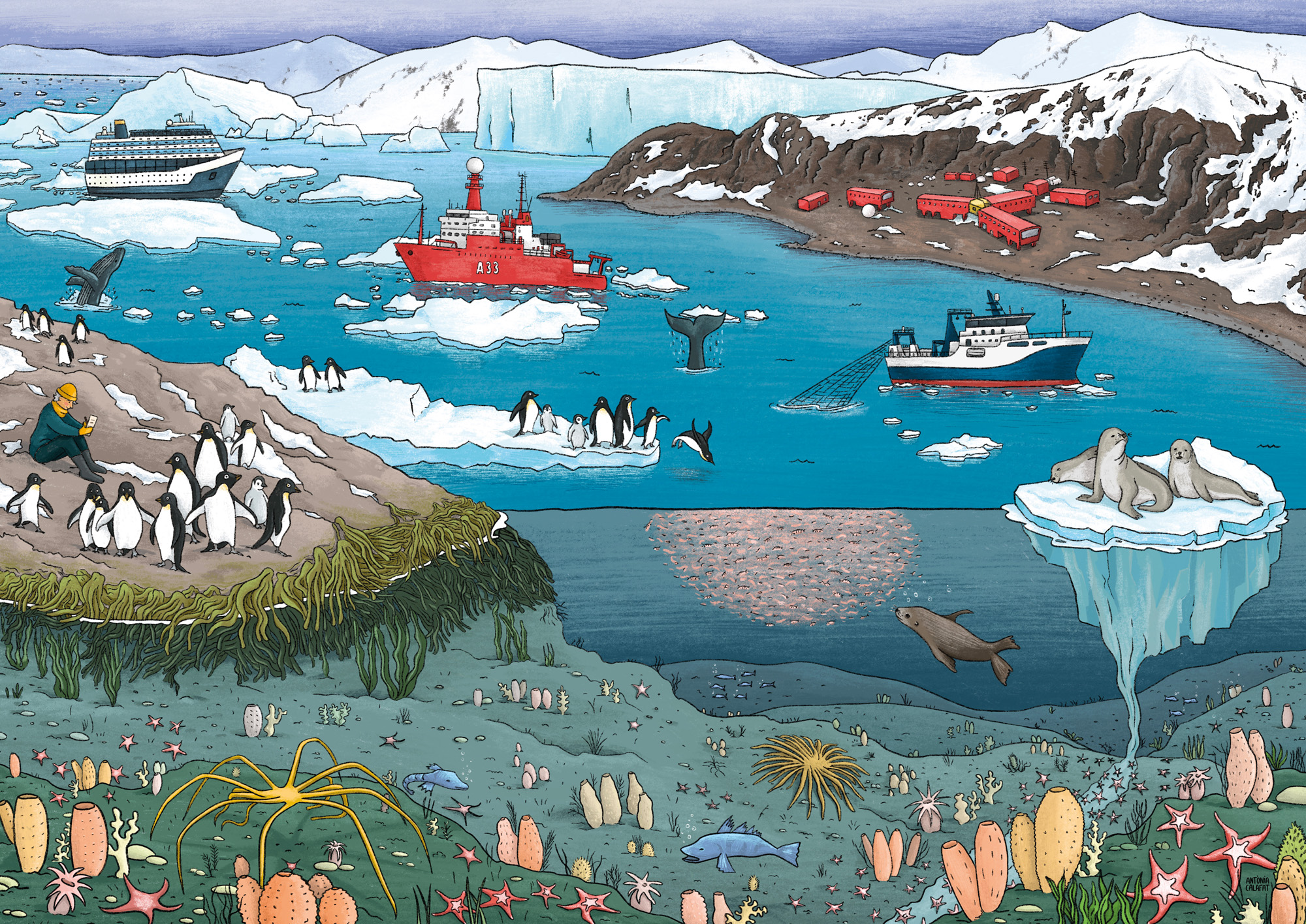 Cada làmina representa un aspecte diferent del medi marí, incloent escenes de l’Antàrtida, el litoral, l’oceà profund, la vida en un vaixell oceanogràfic i la promoció de la igualtat de gènere en la ciència. Aquestes il·lustracions permeten transmetre conceptes complexos de manera visual i educativa, oferint un recurs didàctic complet i estimulant.
